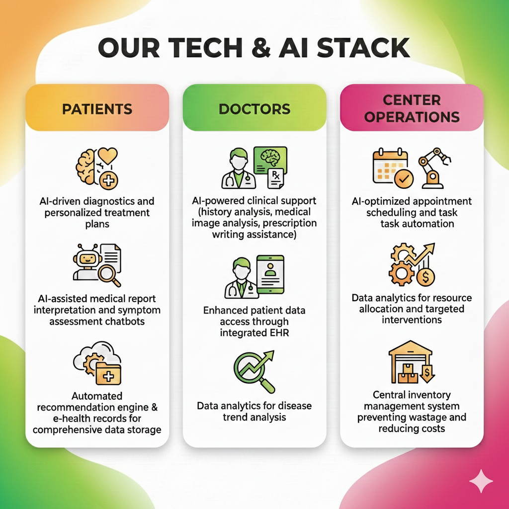 AI-powered clinical support (history analysis, medical image analysis, prescription writing assistance).